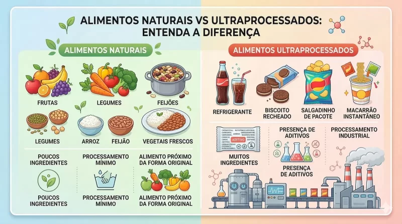 Para compreender melhor como esses alimentos aparecem no cotidiano, veja também o artigo que explica a diferença entre alimentos naturais e ultraprocessados.